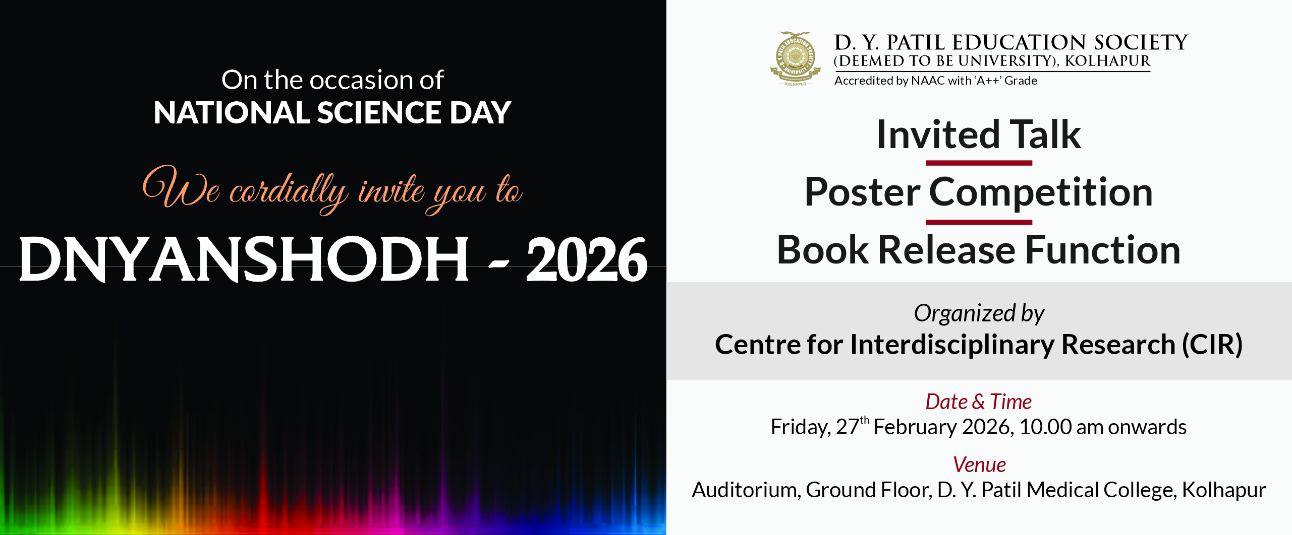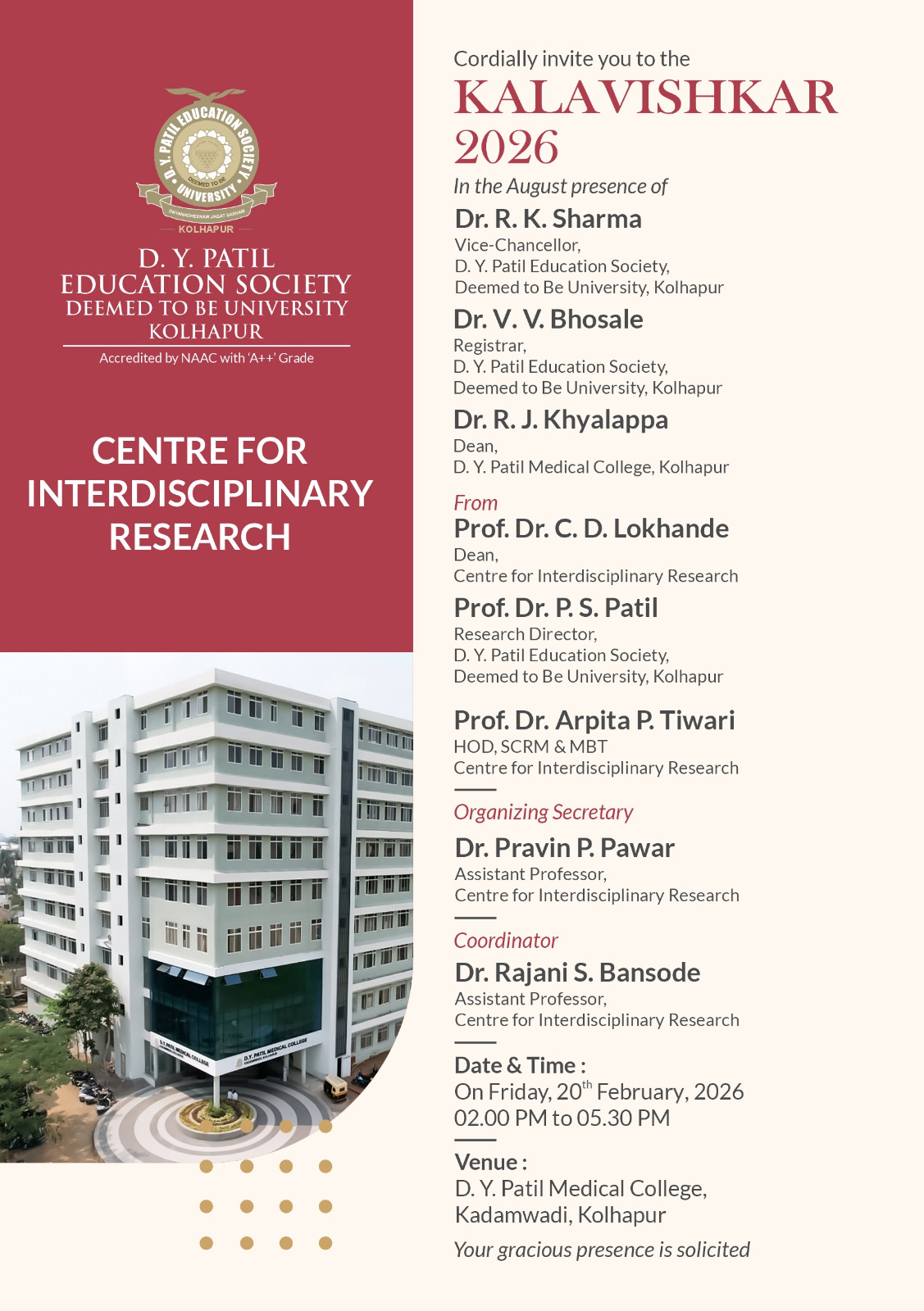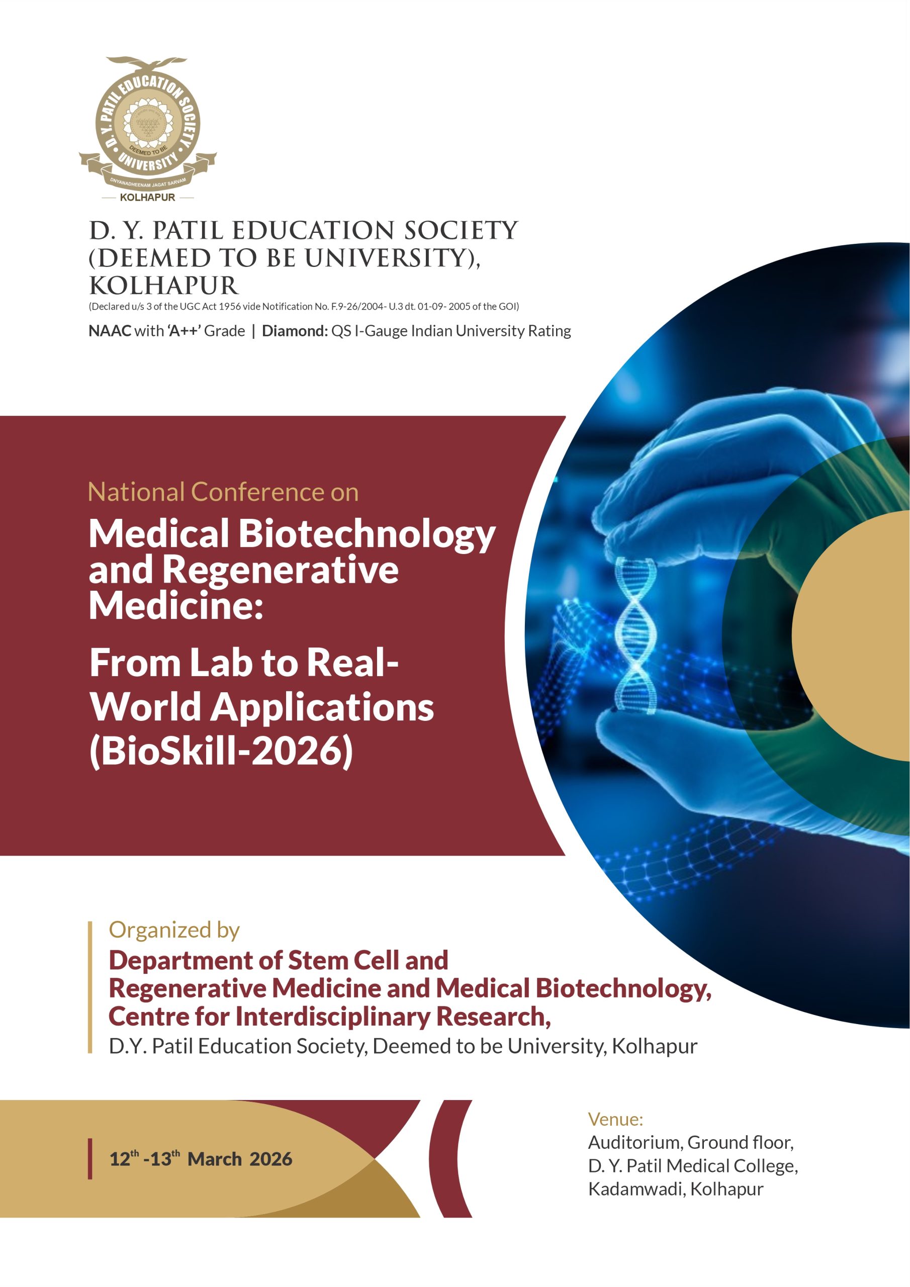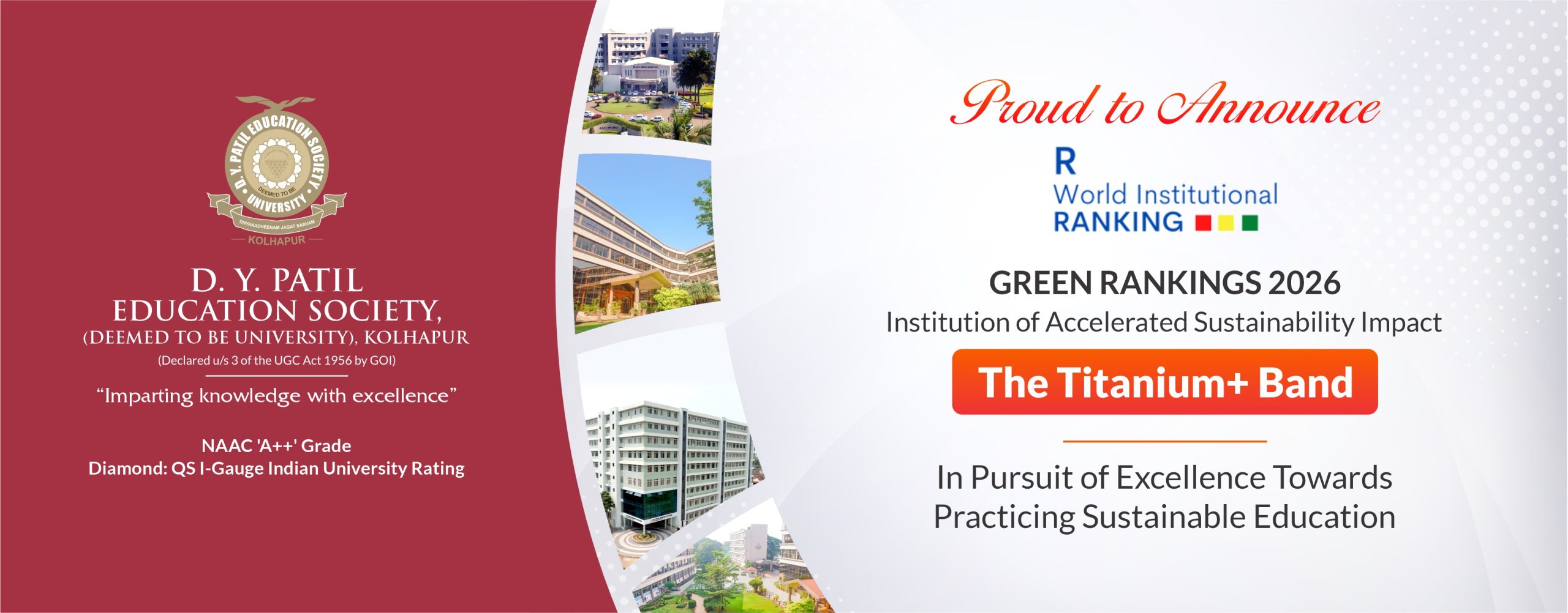 D. Y. Patil Education Society (Institution Deemed to be University) was established on 1st September 2005 under Section 3 of the UGC Act 1956. Since then, the University has developed into one of the premier educational. Institutes in the country offering undergraduate and postgraduate programmes in various disciplines in Medicine and Interdisciplinary fields, fulfilling the aspirations of students hailing from several parts of the country. The University comprises of a Medical. College, Nursing College, School. of Hospitality Studies which are actively engaged in teaching at UG, PG and Diploma levels as well as a Centre for Interdisciplinary Research.